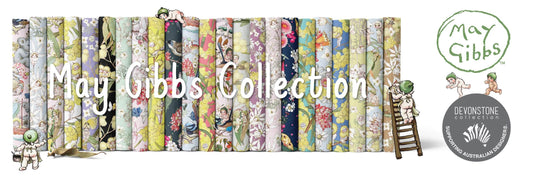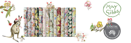The first official May Gibbs fabric collection is here, with 23 quilting cottons and 6 widebacks designed by Devonstone Collection.