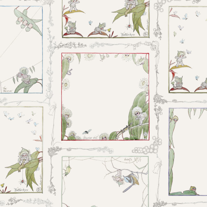 This May Gibbs cotton lawn features a repeating handkerchief-style design with framed illustrations inspired by original May Gibbs artwork. The lightweight, finely woven base makes it ideal for fussy cutting, patchwork, garment sewing, heirloom projects, and small crafted appliqués.