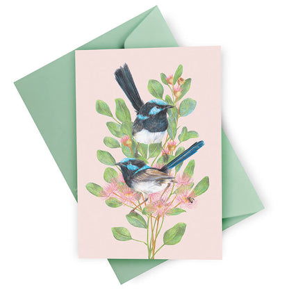 Featuring a print of two male Superb Fairy Wrens amongst Australian native flowers, from Kayla Reay's bird bouquet series. This is a great greeting card for an anniversary, wedding, engagement, or birthday, especially for the bird lover in your life!