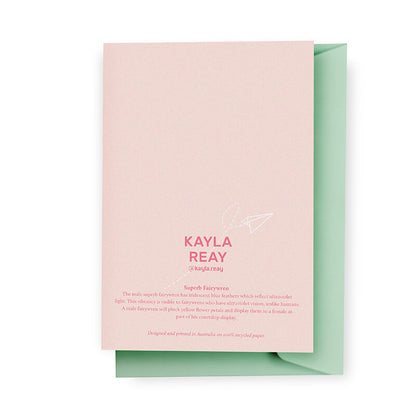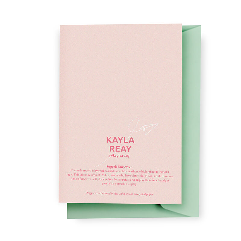 Printed on 100% recycled paper in Australia. The greeting card is heavyweight 300gsm recycled paper and comes with a green envelope. The interior of the card is blank. The back of the card has some facts about the bird featured on the front.